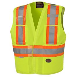 •100% ANSI Polyester Fabric •Yellow with Orange Trim •High Visible Reflective Tape •ID pocket •4 sealed pockets, 1 Radio phone clip strap, •Hook & loop closure All packed 50/Case.